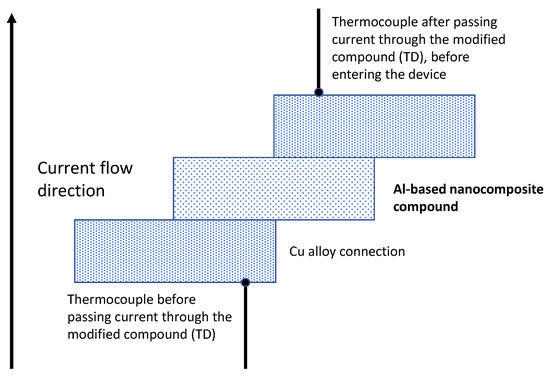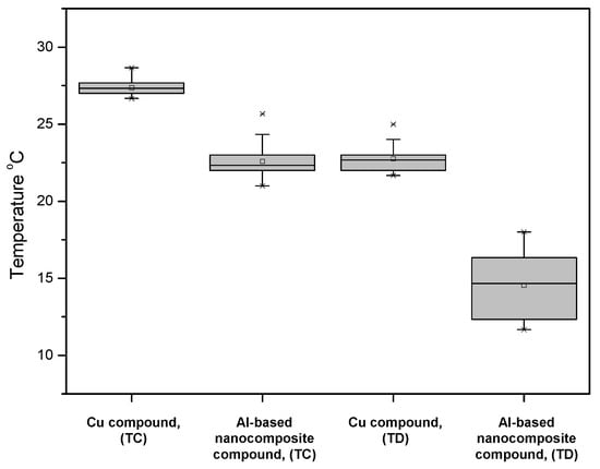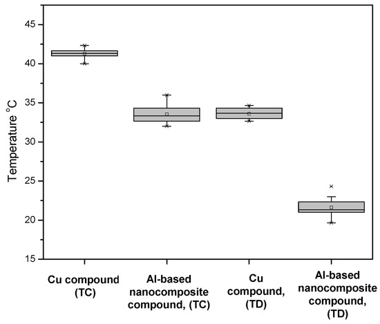 An experimental configuration was used to measure the samples’ thermal performance. Figure 7 shows the results obtained from the performance of the circuit breaker device subjected to 80% of its nominal current. The temperature value (23 °C) of the Al-based nanocomposite compound was lower than the temperature value (27 °C) of the Cu compound at the TC terminal that was made from sintered Cu alloy CDA 110, with a silver-plated surface finish. The temperatures recorded at the TD terminal showed a behavior like that reported at the TC terminal. The temperature of the nanocomposite sample was about 8 °C lower than that of the Cu compound.