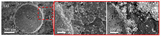 Figure 6 shows the SEM images of coated nanocomposite sample wear. The wear test marks indicate that there was a material detachment in the area tested and in the surroundings of the printed mark. The EDS-SEM elemental mapping performed on the tested surface revealed that the element present in greater abundance was aluminum (Figure 6b). This indicates that the Zn coating flaked off during the test (Figure 6c). SEM micrographs revealed delamination, plow marks, and grooves in the slip direction on the worn surfaces (Figure 6a). It was also observed that the imprint in the wear zone had a width of around 1.84 mm. The applied load of 20 N on the surface of coated nanocomposite showed that the adhesion of the coating was weak due to the detachment of Zn from the sample surface.