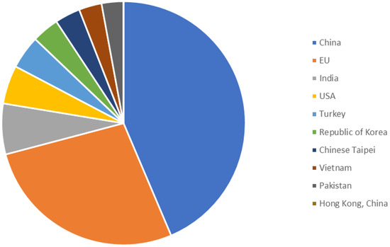 In modern times, dyes have been used extensively in many fields which require their products to be colored, ranging from wool to leather, textile, paper, rubber, and plastics [2,3,4]. Among the major industries that are known to contribute to the presence of dye effluents in the environment, the textile industry has the highest percentage. According to world trade export data from 2018, China is the major exporter of textiles, followed by the European Union and India [5], as shown in Figure 1. Without any proper treatment prior, dyes are released into the ecosystem. Due to their aromatic structure, they are non-biodegradable and may have a deleterious effect on both the ecosystem and the health of human beings dependent on the water source for their daily activities [6]. The presence of dyes on the surface and subsurface of water not only makes the environment less attractive but also may potentially be a source of water-borne diseases, viz. mucous membrane dermatitis, perforation of the nasal septum, and severe irritation of the respiratory tract [7]. At the same time, dyes obstruct the pathway of sunlight in the water, thus blocking the photosynthesis of aquatic plants. Most synthetic dyes are highly toxic, mutagenic, and carcinogenic, thus posing problems to the environment and human beings [8,9]. Several types of synthetic dyes can be categorized based on their molecular structure, for instance, azo dyes and anthraquinone dyes (see Table 1).