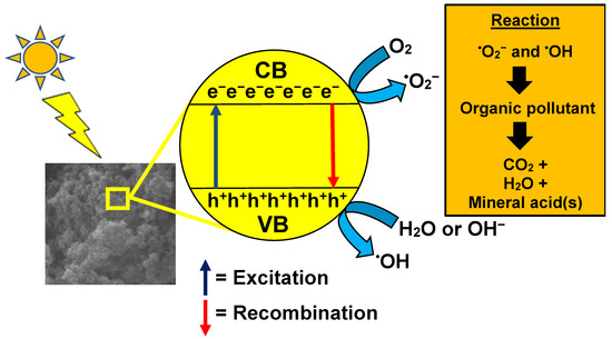 Photocatalysis involves a semiconductor in which electrons are excited from the valence band to the conduction band upon irradiation by a light source with energy equivalent or greater to the bandgap of the semiconductor [76,77]. The implementation of photocatalysis can overcome the disadvantages of other organic waste removal methods, providing complete degradation of organic pollutants and reducing operation costs because the irradiation source can be from renewable sunlight. As a result, the ease of application has made it one of the commonly practiced methods in wastewater treatment [78].
