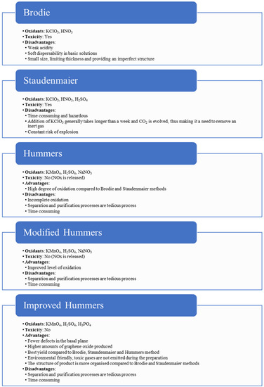 In 1958, Hummers et al. introduced KMnO4 to oxidize graphite sheets instead of KClO3 as it is safer. At the same time, sodium nitrate was used instead of fuming nitric acid to eliminate the production of fog acid. The advantages of Hummer’s method are that the process takes a few hours instead of a few days and yields high-quality GO. The disadvantage of Hummer’s method is that it produces toxic gases such as NO2 and N2O4. Nevertheless, the hazards of HNO3 and KClO3 discouraged any further use and have inspired new pathways for a safer and efficient method of graphene oxide synthesis. Modifications were made to Hummer’s method and Marcano et al.’s improvements, with an increased amount of KMnO4, and replacement of NaNO3 by substituting the combination of H2SO4 and H3PO4 with a ratio of 9:1 [102]. With the improvements, the method shows an even higher degree of oxidation and graphene product yield with enhanced hydrophilic properties. Figure 3 summarizes the different GO synthesis methods.