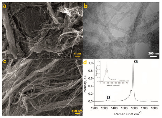 The used Tuball CNTs were characterized by SEM and Raman spectroscopy (Figure 1). The SEM images (Figure 1a) reveal that nanotubes exist mainly in the form of thick bundles consisting of tens and hundreds of individual nanotubes. According to the higher magnification SEM and TEM images [38], the primary bundles with diameters of 5–10 nm are assembled into secondary and even tertiary bundles with diameters of up to 50 nm. The existence of Tuball nanotubes in the form of bundles is a consequence of their longer length compared to other commercially available SWCNTs, such as HiPCo, CoMoCat, etc. [36].
