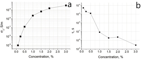 Figure 4a shows that the DC-conductivity σ0 smoothly increases with increasing the filler content in the composites that is in accordance with the literature values [7]. The dependence of the relaxation times on the filler concentration in the samples is shown in Figure 4b. In general, relaxation time decreases with an increase in the filler concentration.
