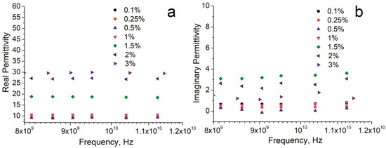 Comparison of our data with the published literature data in the X-band is presented in Table 2. Again, the permittivity values registered in this work notably exceed the literature data [18,26,40,41]. Even the use of the polar polymer host, such as PVDF [41], does not enable the values, attained in our study. At the same time, the values of the imaginary part of the dielectric permittivity, registered in this study (Figure 5b), are among the lowest in the literature [49].