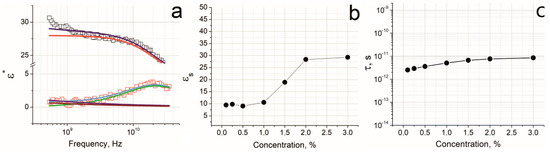 Figure 6c represents the function of the relaxation time τ on the filler content in the UHF region. The values of τ insignificantly change with increasing the filler content; that they have the same order of magnitude as opposed to the situation in the low-frequency region in which they differ ~105 times in the tested range of the filler contents (Figure 4b).