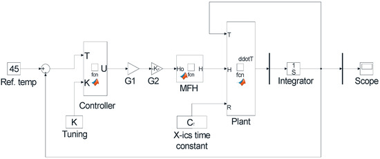 In nanoparticle hyperthermia temperature control, all three combinations of the PID controller are applied. MATLAB software is used for modeling, as used by various studies in the literature [67,68,69]. MATLAB Simulink (R2021a) is used to define the system transfer function as functional blocks and then a PID Controller block is linked to the input of the plant as shown in Figure 6.