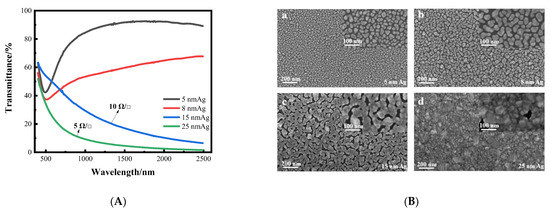 (A) Curves of transmittance of silver films with different thickness varying with wavelength. (B) SEM images of silver films with different thickness on a K9 substrate (a–d).