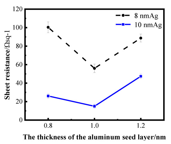 The thickness range of aluminum seed layer was determined by reading relevant literature and conducting exploratory experiments in the early stage. Aluminum films of 1 nm and 2 nm were prepared on a K9 glass substrate and used as the seed layer of silver film. After plating silver films of different thickness on the seed layer, it was found that the infiltration effect of a 2 nm aluminum seed layer on the silver film was not obvious; that is, compared with the single layer silver film, the performance of the silver film was not greatly improved. Sheet resistance can be measured in silver films with 1 nm Al seed layer, indicating that the silver film is relatively continuous. Then, the thickness around 1 nm of the aluminum seed layer was refined and studied. The following figure shows the sheet resistance curves of the silver film with a 0.8 nm, 1 nm and 1.2 nm aluminum seed layer, respectively, for 8 nm and 10 nm silver film.