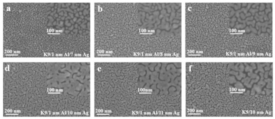 SEM images of silver films with aluminum seed layer of different thickness (a–f).