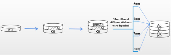 As can be seen in Figure 8, the 1 nm aluminum seed layer was deposited into two layers. First, the 0.5 nm aluminum seed layer was deposited on the glass substrate, then the 0.5 nm silver film was deposited, then the 0.5 nm aluminum seed layer was deposited, and finally, silver film of different thickness was deposited on this base. Previously, we also tried to divide the 1 nm aluminum seed layer into three or four layers for deposition, but the experimental results show that the deposition effect of two layers is more obvious, and the process of two layers is relatively simple and convenient.