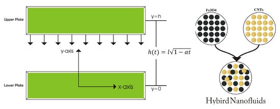 We consider the flow of hybrid nanofluids between two horizontal infinite parallel plates, as depicted in Figure 1. The distance between two plates has taken as = ; furthemore, the upper plate move towards the lower plate with velocity . We assumed that the temperature is constant at the upper plate, and the flow of hybrid nanofluid (CNTs-/) in the channel is incompressible and viscid. The physical characteristics of hybrid nanofluid flow CNTs-/) rely on time. As a result of the greater influence of variable magnetic fields, this type of behaviour of hybrid nanofluid is thought to be due to their magnetic characteristics. Single and multi-wall carbon nanotubes, on the other hand, have larger thermal conductivity. Subsequently, the hybrid nanofluid (CNTs-/) is developed by suspending a new volume fraction of CNT ( = 0.5) into the originally formulated ferrofluid (/). The mathematical formulation of the aforementioned hybrid nanofluids by continuity, momentum, magnetic field and energy conservation equations are as follows: