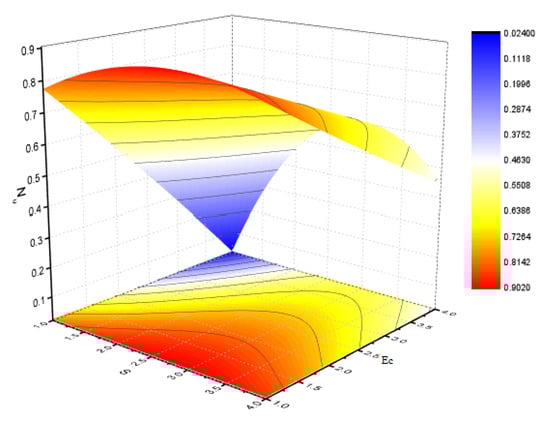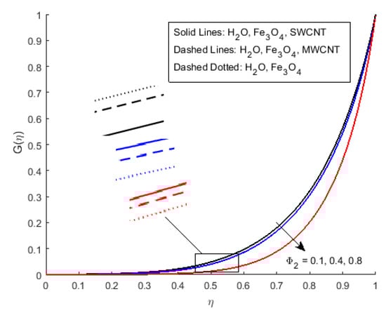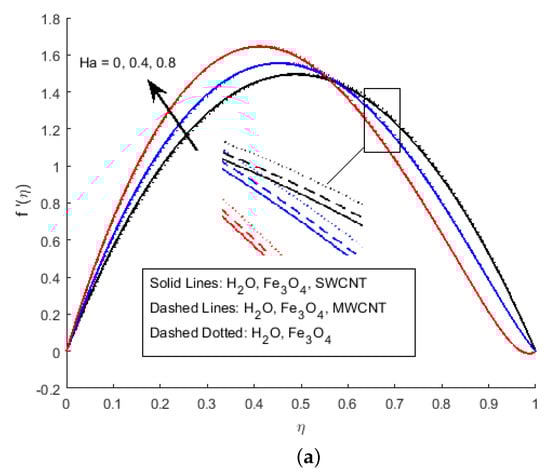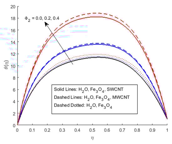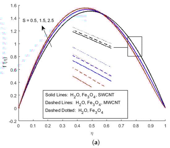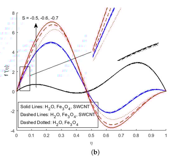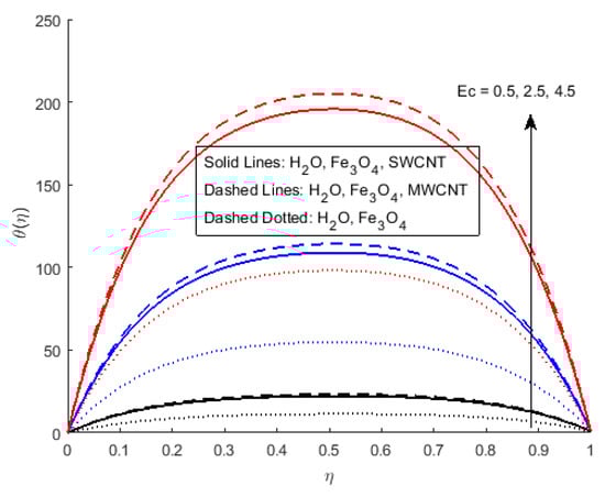 Figure 6 illustrates the impact of on the magnetic profile, which signifies that an opposing force is generated due to magnetic fields, as well as an improvement in the fluid viscosity due to the suspension of nanomaterials concentration. This is the basic reason for the fall in the magnetic field. The outcomes reflect that, as the concentration of nanomaterials rises, the magnetic field decreases. Figure 7a explains the impact of growing Eckert number on the temperature profile. The Eckert number is the ratio of kinetic energy to the boundary layer enthalpy difference and is used to explained heat dissipation. An abrupt surge for the temperature profile in the vicinity of the middle line has been noticed, as we know simply the ratio of specific heat to thermal conductivity, so it raises the temperature profile considerably, and profile becomes parabolic, which gives the maximum value at the middle of the channel. The heat transmission of (MWCNTs, and ) is slightly more than (SWCNTs, and ). The fluctuation that occurs in temperature profile due to the rising value of nanomaterials volume fraction has been displayed in Figure 8. A rise in the volume fraction of nanomaterials augments heat transmission and generation of heat, which grow the thickness of the thermal layer. In the case of diverging channels, a significant increase in temperature is observed. Nearly the same values for both and with and have been observed. The velocity slip parameter significantly affects the temperature profile. Figure 9 and Figure 10 are drawn to investigate the effects of S, , and S, on skin friction and Nusselt number.