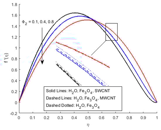 In Figure 2a, it has been observed that the velocity profile for different values of the squeezing parameter S increases the velocity profile more near the channel due to the rising force in the horizontal direction. This increment in force has a resistance force near the centre, which decreases the horizontal velocity after the central region. Figure 2b depicts that the growing value of squeezing parameter S improves the velocity profile, it is because the velocity gradient is falling near the channel wall for , while vertical velocity is rising due to narrowing the channel of the flow for the value . The velocity profile of the flow is plotted in Figure 3a,b, illustrates that and are rising. Furthermore, it explains that the increasing value of the Hartmann number raises the velocity profile for , and reduces it for . Cross-flow behaviour for the velocity profile has been observed at the centre of the channel wall. The effect of the nano-material volume friction is depicted in Figure 4. It is noticed that a rise in the quantity of nanomaterials significantly fluctuates the velocity profile near the channel wall due to the increase in the density of the nano-materials. Moreover, the velocity of SWCNTs is slightly higher than that of MWCNTs, due to the low-density values of SWCNTs.