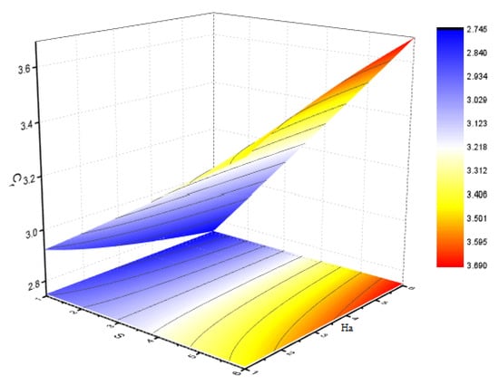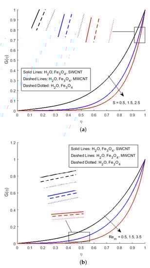 Figure 5a displays the influence of the squeezing parameter S on the magnetic field profile , which illustrates that the magnetic profile becomes parabolic for the various value of the squeezing parameter. Body force is stronger near the bottom of the corresponding main wall because the Lorentz force is smaller near the squeezing plate (because the current is approximately parallel to the magnetic field). Initially, for the x-component of velocity, the velocity decline is identified, but starts augmenting as maximum value of is noticed in the middle. In the study of the magnetic profile, we have observed that the magnetic profile is falling in the vicinity of the upper plate when the squeezing parameter increases. Figure 5b shows the falling behaviour of the magnetic Reynold’s parameter , which defines the ratio of fluid flux to the magnetic diffusivity. This parameter therefore is an instrumental in determining the diffusion of magnetic field along streamlines. The variation in has direct effect on . As the increase in magnetic Reynold’s number increases, the opposing force of the axial velocity decreases the axial velocity of the flow. In our study, less importance has been placed on diffusion, and most of the analysis is based on the behaviour of the magnetic field during the flow.