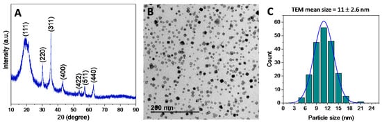 In details, the XRD pattern of the resulting powders (Figure 1A) displays the characteristic maxima (2 2 0), (3 1 1), (4 0 0), (4 2 2), (5 1 1), and (4 4 0) of a Fe3O4 magnetite phase [46]. In addition, TEM analysis (Figure 1B) confirmed a fairly uniform nanoparticle size, with dimensions of ca. 11 nm, and octahedral or truncated octahedral nanoparticle morphologies. As further confirmation, Figure 1C shows the histogram of nanoparticle diameters (n = 200) as measured in TEM images with the best-fit lognormal distribution superimposed. The mean size and the standard deviation from the statistical analysis resulted in being 11.0 ± 2.6 nm, in agreement with the previous data. The normality test using the Kolmogorov-Smirnov approximation indicates that the data are significantly drawn from a normally distributed population. The dispersity value, or polydispersity index, of 0.24 was calculated as the ratio between the standard deviation and the mean of the particle diameter distribution, confirming that the size distribution of Fe3O4-OA nanoparticles presents a homogeneous population, as indicated by values lower than 0.3 [47].