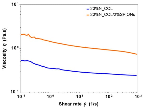 Viscosity of collagen formulation before (20% N_COL) and after (20% N_COL/2% SPIONs) the incorporation of the SPIONs.