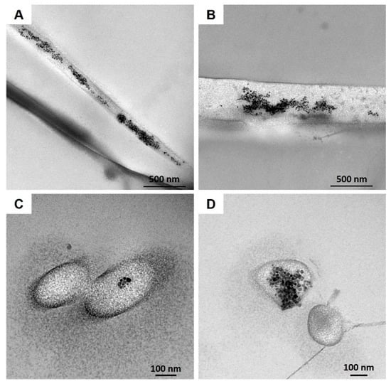 TEM images of 20% N_COL/2% SPIONs highlighting the SPION distribution into the collagen fibers: horizontal (A,B) and vertical sections (C,D).