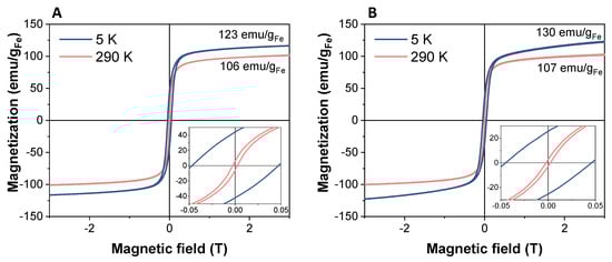 Magnetization curves of Fe3O4-DMSA nanoparticles (A) and 20% N_COL/2% SPIONs scaffold (B) normalized to the grams of iron. The magnification of the curves at low fields is shown in the insets.