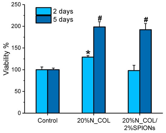 Cell viability of hMSCs incubated onto 20% N_COL and 20% N_COL/2% SPIONs scaffolds after 2 and 5 days (measured by Alamar Blue). * indicate p < 0.01 vs. control; # indicate p < 0.001 vs. control.