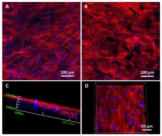 Representative confocal laser scanning microscopy images of hMSCs cultured onto 20% N_COL (A) and 20% N_COL/2% SPIONs (B–D) scaffolds for 5 days. F-actin microfilaments were stained with Atto 565-phaloidin to visualize the cytoskeleton and determine cell morphology (red fluorescence). Nuclei were stained with DAPI (blue fluorescence). Images were generated using Z-axis projections (A,B). (C,D) 3D-reconstruction and different magnification of the z-projection corresponding to 20% N_COL/2% SPIONs electrospun scaffold. (C) 3D reconstruction at low magnification taken from the surface until a z-height of 200 microns. (D) 3D reconstruction at higher magnification taken from the center of the scaffold thickness down to 100 microns.