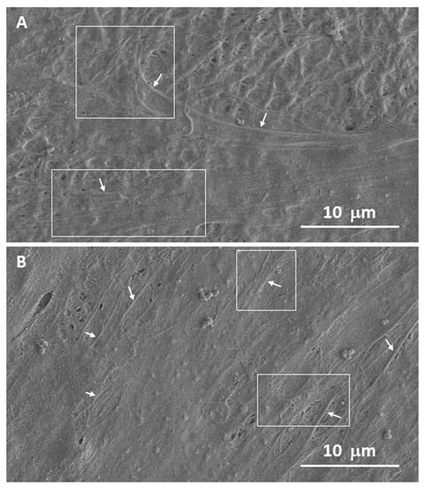 Representative SEM micrographs of hMSCs cultured onto 20% N_COL (A) and 20% N_COL/2% SPIONs (B) after 5 days of incubation. The areas highlighted in the images with arrows and boxes indicate the different projections of these cells in the form of filopodia and lamellipodia, respectively.