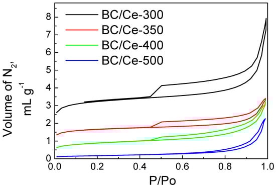 The adsorption/desorption isotherms for the hybrid samples are presented in Figure 1. The SSA was lower at higher temperatures of calcination. The samples calcined at 300–400 °C exhibited type IV with an H4 hysteresis loop, while for the BC/Ce-500 sample, the hysteresis loop was between H3 and H4. H4 loops are often found in micro-meso porous carbon materials []. The BC/Ce-500 sample also exhibited limited N2 adsorption at low P/Po values, suggesting low microporosity, in contrast with the other three samples. SSA values were higher than the commercial CeO2 with a SSA of 4 m2 g−1.