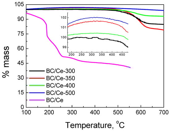 This was confirmed by the pore size distribution shown in Figure 2. The BC/Ce-500 had a limited amount of micropores (if any), in contrast with the other samples calcined at lower temperatures. For the BC/Ce-500 sample, there was a peak centered at about 85 nm, while the main peak was at 60 nm for the other samples; an additional peak was centered at 13 nm for BC/Ce-400. This increment in pore diameter was due to higher calcination temperature and the collapse of microporosity.