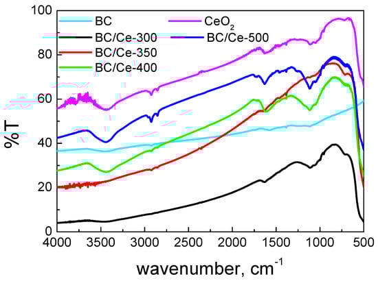 The FTIR spectra of the prepared samples are presented in Figure 4, together with the spectra of BC and commercial CeO2. The FTIR peaks were more intense in the prepared materials in contrast with the commercial CeO2. This may be due to the different SSA values, which were higher in the prepared samples, suggesting the existence of more surface groups. On the other hand, the BC/Ce-300 and BC/Ce-350 samples had peaks with low intensity, suggesting that CeO2 was less bulk in these samples.
