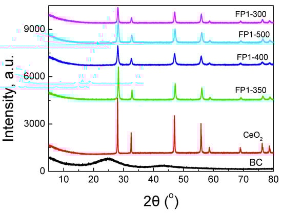 The XRD patterns of the prepared samples, alongside the BC and commercial CeO2, are presented in Figure 5; the main peaks can be evidently attributed to CeO2. The average diameter of the CeO2 particles calculated from the Scherrer equation varied from 29.7 to 16 nm, while for the commercial CeO2, it was 46.2 nm.