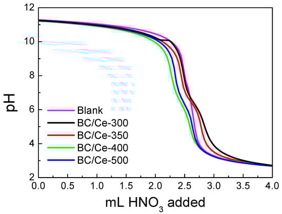 The acid–base behavior of the samples is presented in Figure 6. The potentiometric titration curves revealed that the two materials prepared at the lower calcination temperatures had a pzc near 7 (6.8 and 6.5 for the BC/Ce-300 and BC/Ce-350, respectively), while the two other samples had a pzc value equal to 3, pointing out the acidity of these samples. Generally, low pzc values have been reported for CeO2 when the precursor is Ce(III) salt, as in our case [].