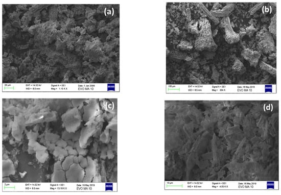 On the other hand, higher calcination temperatures lead to greater removal of the carbon phase, and thus CeO2 is better formed. Carbon removal in the form of volatile compounds results in CeO2 cracking and this facilitates the formation of the surface area of the sample; this can be seen in Figure 7c for the BC/Ce-400 sample. Even higher calcination temperatures may result in sintering of the CeO2 particles and, eventually, greater degree of agglomeration (Figure 7d). These findings are in accordance with the SSA values (Table 1) and the XRD results.