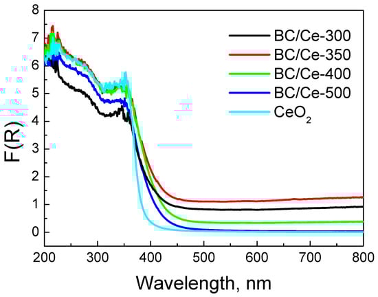 The DR spectra of the prepared samples are similar to that of CeO2, especially at wavelengths lower than 400 nm (Figure 8). In the UV and Vis near UV regions, the peaks are due to charge transfer between the Ce(IV) and O2− species. The DR spectrum of CeO2 showed three maxima at about 220, 270, and 330 nm. The peak at 220 nm was assigned to f-d transition of Ce(II), the band at 270 nm to surface sites, and the band at 330 nm to bulk sites [,,,]. The exact location of the peaks is highly influenced by the size of CeO2 crystallites. At wavelengths higher than 400 nm, CeO2 exhibits negligible absorbance and this is also the case for BC/Ce-500 (i.e., the sample with the minimum BC content). The other three samples exhibited a constant absorbance over the whole range of the Vis spectrum, which was due to the black color of the biochar. The absorbance intensity was well correlated to the BC content, with the BC/Ce-350 sample showing the higher intensity. For the prepared samples, the point where a sharp increase in absorbance occurred shifted at higher wavelengths. This implies a change in the distribution of electrons and can be confirmed from the energy gap values for each material. These values were between 3.08–3.12 eV for all the prepared samples and 3.32 eV for commercial CeO2 (Table 1). The observed red shift in the absorbance of the samples is correlated to the smaller size of CeO2 nanoparticles, in contrast with the commercial CeO2.