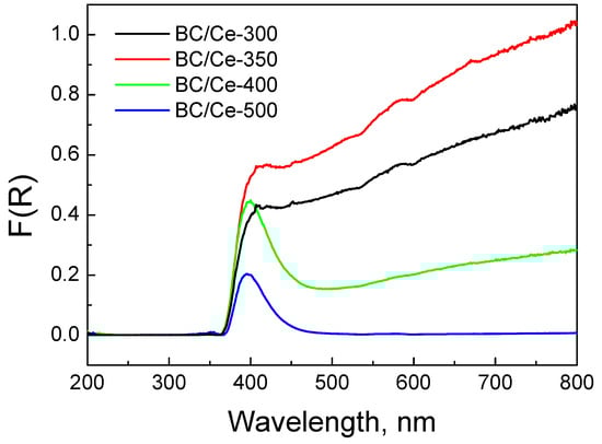Changes in electrons distribution are more clearly demonstrated in Figure 9, where commercial CeO2 was employed as the reference. Indeed, the peak centered at about 400 nm revealed that interactions were more pronounced for the samples with increased BC content.