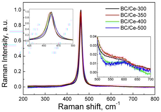 Figure 10 shows the normalized Raman spectra for the prepared samples. There was an intense peak centered between 460 and 464 cm−1, which corresponded to the F2g Raman vibrational mode of cubic fluorite lattice of CeO2 [,,]. The broadness and asymmetry of the peak imply the existence of nanosized CeO2 particles. The particle size as well as possible changes in composition associated with varying BC content influence the exact position and the broadening of the peak with a shift toward lower frequencies. There was another broad peak at about 600 cm−1, which can be attributed to oxygen vacancies of CeO2 [,]. It is interesting to note that this peak was broader and more intense for the samples with higher BC content.