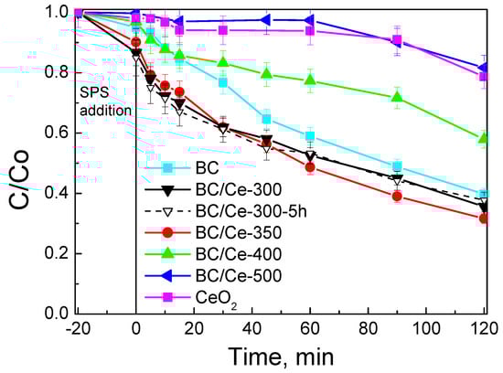 Based on the results shown in Figure 11, subsequent activity tests were performed with the BC/Ce-350 material.