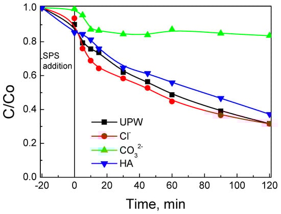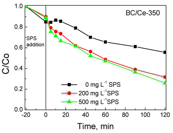 The influence of SPS concentration on SMX degradation is presented in Figure 12. In the absence of SPS, SMX removal can occur to a considerable extent due to adsorption only (i.e., 45% at the end of the experiment). The addition of SPS in the range 200–500 mg L−1 promotes SMX removal due to the reactions occurring between the generated radicals and SMX. Interestingly, the rate was not affected by the level of oxidant concentration used with the apparent rate constant being 9.1 ± 0.1 10−3 min−1; this value was about 2.5 times greater than that of pure adsorption.