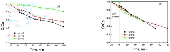 Since the pzc value of BC/Ce-350 was 6.5 (Table 1), its surface was slightly positive at an ambient pH of 5, which favors the attraction of the negatively charged S2O82− anions. SMX, on the other hand, was neutral at pKa1 = 1.77 < pH < pka2 = 5.65 [,,,]. SMX was positively charged at pH < 1.4 (protonation of –NH2 group) and negatively charged at pH > 5.65 (deprotonation of –NH). To assess the effect of the initial solution pH on SMX removal, experiments were performed by adjusting the ambient pH = 5 to more acidic (pH = 3) or basic conditions (pH = 9), and the results are shown in Figure 13a for adsorption in the absence of an oxidant and 13b for oxidative degradation.