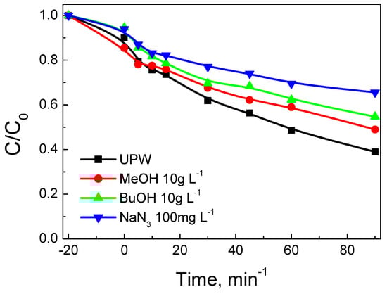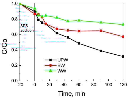 The effect of water matrix on SMX removal is depicted in Figure 14. Reactivity decreased with increasing matrix complexity (i.e., UPW (8.9 × 10−3) > BW (3.2 × 10−3) > WW (1.6 × 10−3)), with numbers in brackets showing k values in min−1. The role of the water matrix is associated with the various inorganic and organic, non-target species that are inherently present and may compete with SMX for the active catalytic sites and/or the oxidant.