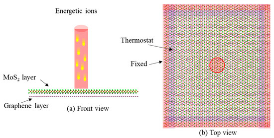 In this study, the classical MD simulation method is applied through the large scale atomic/molecular massively parallel simulator (LAMMPS) software [29]. LAMMPS is an open source package with a record of successful demonstrations in describing the interactions between ions and 2D materials [30,31,32]. Ar ions are selected for the irradiation, since they are rich as an ion source in experiments [33,34] and widely used in other simulation studies [22]. Monolayer graphene-MoS2 (G/M or M/G) heterostructures are the impact target. The nanopore in a heterostructure is generated through the transfer of momentum energy from energetic Ar to the heterostructure layers. To mimic this process, a hybrid atomic potential is adopted. The interaction between Ar ions and atoms in a heterostructure is described by the Ziegler–Biersack–Littmark (ZBL) universal repulsive potential [35], which can present atomic interaction at small separation during the irradiation. The interaction between the atoms in MoS2 is captured by a second-generation reactive empirical bond-order (REBO) potential [36], and the interaction between the atoms in graphene is considered as an adaptive intermolecular reactive bond order (AIREBO) potential [37]. The vdW interaction between MoS2 and graphene crystal is modeled by the Lennard–Jones (LJ) potential [38], which is parameterized according to [39,40]. The simulation model is illustrated in Figure 1, which presents an in-plane size of 115 × 130 Å with 11,124 atoms. The in-plane directions of the simulation box are assigned with periodic boundary conditions, while the out-of-plane direction is fixed to allow the injection of ion beams. During the ion irradiation process, the outermost several layers of the heterostructure are fixed, and several adjacent layers are assigned with Berendsen temperature control [41], as shown in Figure 1b. This strategy could prevent the heterostructure from overall movement, and minimize the side effects of the ion induced pressure wave as well. The system is first equilibrized through an NVT ensemble at 300 K for enough time to reach a relaxed state. Then, consecutive Ar ions are randomly emitted from a cylinder with the axis located at the center of the heterostructure. The radius of the irradiated spot is 10 Å which can be achieved by using a focused ion beam technique in the experiment [42], and the cylinder is 40 Å on top of the heterostructure plane. Ar ions are irradiated every 1000 timesteps with a step size of 0.5 fs to achieve a certain dose, during which process the system is stabilized at 300 K. In this study, various ion doses from 1.59 × 1015 /cm2 to 2.54 × 1016 /cm2 and various ion energies from 40 eV to 5000 eV are considered to uncover the influence of ion parameters on the fabrication of the nanopore. The studied ranges of ion dose and ion energy also match the experimental conditions well [33,34]. After the irradiation stage, the irradiated structures are annealed at 2000 K for enough time to mimic the long-time annealing process in actual experiments. Finally, the system is cooled to room temperature, and kept at this state. The above simulation scheme can reveal the phenomena during the ion irradiation process, as demonstrated by many researchers [32,43].