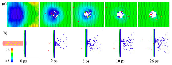 Structural evolution of the G/M heterostructure under ion irradiation. (a) Front view, and (b) left view. Ion energy is 200 eV, ion dose is 1.27 × 1016 /cm2. The atoms are colored according to the z coordinates. z is defined as the coordinate axis along the irradiation direction.