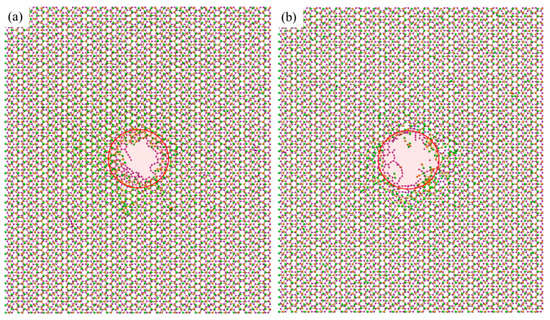 Figure 13 shows the dynamics of structural evolution of the M/G heterostructure nanopore under ion irradiation with different irradiation parameters. It is seen that under the parameter pair of 80 eV, 3.18 × 1015 /cm2, there is nanopore formation only in the top MoS2 layer, while the bottom graphene layer is undamaged, resulting in the initiation of the crack in MoS2 layer, different from the case in Figure 9. In contrast, if we use the ion parameter pair of 400 eV, 1.27 × 1016 /cm2, a good-quality nanopore is formed in both the MoS2 and graphene layers, because of which the initiation of the crack happens in graphene layer again, similar to the case of G/M heterostructure. The phenomenon demonstrates that the damage sequence of the heterostructure nanopore can be controlled by adjusting the irradiation parameters.