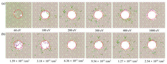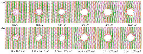 Configurations of the G/M heterostructure under ion irradiation with different ion energies and ion doses. (a) The influence of ion energy under a constant ion dose of 1.27 × 1016 /cm2. (b) The influence of ion dose under a constant ion energy of 200 eV. The red colored circle is used to indicate the irradiation area.
