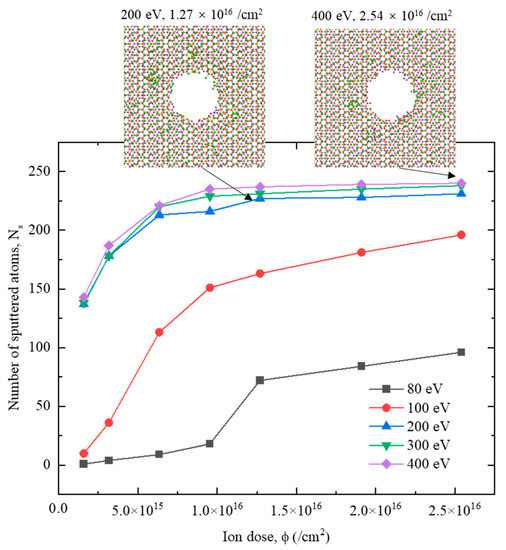 Figure 5 plots the dependence of the number of sputtered atoms of the G/M heterostructure on ion irradiation energy and ion dose. It clearly shows that with the increase of ion irradiation energy and dose, the number of sputtered atoms for all the cases would increase. When the ion irradiation energy is low (80 eV and 100 eV), the number of sputtered atoms is small and increases quickly with the addition of the irradiation dose. It can be expected that under these two cases, the number of sputtered atoms would be further increased if the ion dose is raised beyond the studied range (2.54 × 1016 /cm2). When the irradiation energy is high (200 eV, 300 eV and 400 eV), the number of sputtered atoms is relatively large and a steady status is quickly achieved with the increase of ion irradiation dose. Moreover, the three cases, i.e., 200 eV, 300 eV and 400 eV, present very close data, indicating that 200 eV irradiation energy is large enough to generate the desired pore structure. Further increase of the irradiation energy has limited benefit to the quality of the nanopore, while it would introduce large side effects to the equipment in the experiment. Therefore, 200 eV is determined as the optimal ion irradiation energy. As for the influence of the ion irradiation dose, the number of sputtered atoms becomes stable after reaching the ion dose of 1.27 × 1016 /cm2, indicating 1.27 × 1016 /cm2 as the optimal ion irradiation dose. Therefore, the optimal parameter pair to obtain a high-quality nanopore is derived as 200 eV and 1.27 × 1016 /cm2. The detailed nanopore structures generated under ion irradiation of 200 eV, 1.27 × 1016 /cm2 and 400 eV, 2.54 × 1016 /cm2 are also compared in Figure 5, which shows that the optimal parameter pair is able to generate the desired structure, while increasing ion energy and dose has limited effect on the improvement of the nanopore quality.