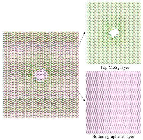 Compared to the results in Figure 5, the configurations of the M/G heterostructure in Figure 6 demonstrate a similar phenomenon—that a nanopore structure in both heterostructures would be gradually generated with the increase of ion irradiation energy and dose, while it seems that the M/G heterostructure requires a higher irradiation energy for nanopore formation. The MoS2 and graphene layer in the M/G heterostructure gets damaged with an obvious order of precedence, i.e., the MoS2 gets damaged first while the damage to the graphene layer depends clearly on the irradiation energy. Therefore, we can suspect that by carefully controlling the ion irradiation energy and dose, a nanopore might be generated in the MoS2 layer only, while the graphene layer stays undamaged. Figure 7 shows that under the ion parameter pair of 80 eV, 3.18 × 1015 /cm2, the nanopore structure can be formed in the top MoS2 layer, with no damage in bottom graphene layer, which cannot be achieved in the case of G/M heterostructure. The selective creation of a nanopore in a MoS2 layer may have important applications which need experimental validation.