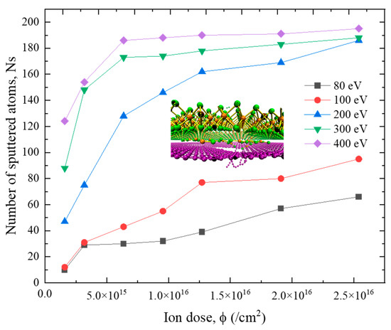 Number of sputtered atoms of the G/M heterostructure under ion irradiation with different ion energies and ion doses. The inserted figures show the configurations of 200 eV, 1.27 × 1016 /cm2, and 400 eV, 2.54 × 1016 /cm2, respectively.