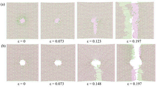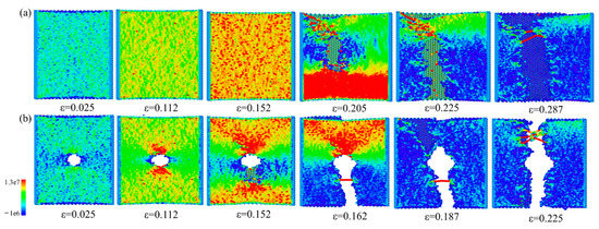 Snapshots of the G/M heterostructure morphology at different tensile strains during uniaxial stretching process. (a) Pristine heterostructure. (b) Heterostructure nanopore generated with an irradiation parameter pair of 200 eV, 1.27 × 1016 /cm2. The structures are colored according to the per-atom stress information along the horizontal direction, and the value has a unit of stress/(per-atom volume).