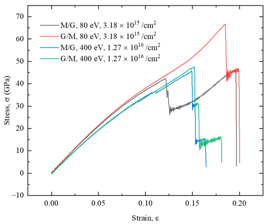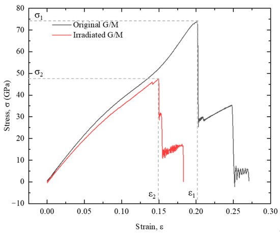 Stress-strain relationship of the G/M heterostructure with and without the ion irradiation process. The irradiation parameters are 200 eV, 1.27 × 1016 /cm2.