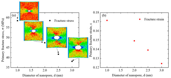 Influence of the G/M heterostructure nanopore size on the mechanical properties. (a) Primary fracture stress, and (b) primary fracture strain. The inserted figures show the per-atom stress distribution just before the fracture of the first stage.