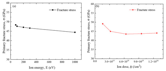 Influence of the (a) irradiation energy and (b) ion dose on the primary mechanical strength of G/M heterostructure. The ion dose for (a) is 1.27 × 1016 /cm2 and the ion energy for (b) is 200 eV, respectively.