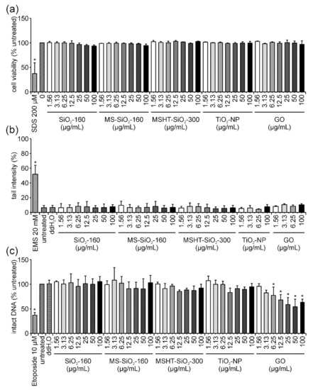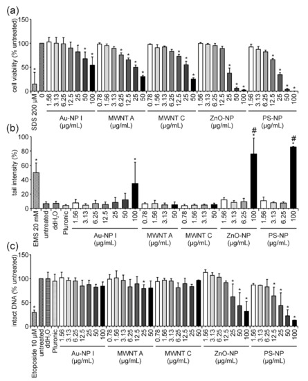 Comet Assay: The alkaline comet assay was performed as previously described by Singh and co-workers in 1988 [22] with the following modifications. Jurkat E6-I cells were seeded in 6-well plates at a density of 5 × 105 cells per well in 1.25 mL CM directly before ENM application. For treatment, a volume of 1.25 mL double-concentrated ENM suspension was added to reach the following final concentrations for ZnO, TiO2, amine-modified PS, GO, SiO2 and Au: 100, 6.25, 3.125, 1.56 μg/mL and 50, 3.125, 1.56, 0.78 μg/mL for MWNTs. The application of 20 mM EMS (Sigma) 30 min before the end of the incubation time served as the positive control. Following 3 h or 24 h of incubation, cells were collected and centrifuged for 6 min at 125× g. The pellets obtained were resuspended in 300 µL CM. All subsequent steps were identical to the protocol described by May and co-workers in 2018 [35]. If not otherwise stated, samples were blinded and 100 randomly chosen comets per sample were analyzed for each experiment. Tail intensities in percentages (=tail intensity (%)) are expressed as the mean of at least three independent experiments and their corresponding standard deviations.
